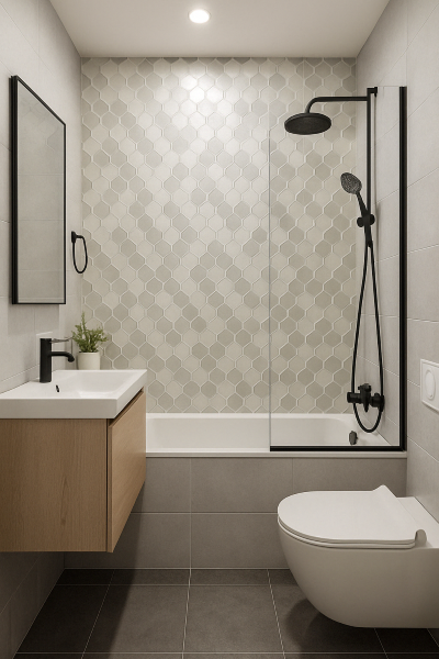 Walls: glossy or matte tiles in neutral tones