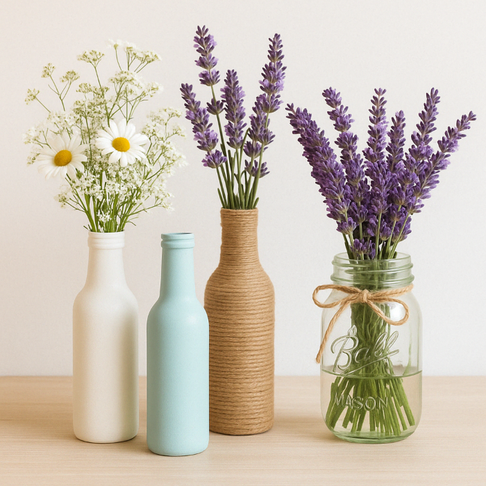 Transform wine bottles into elegant flower vases by painting them or decorating with jute twine, ribbons, or lace. Large jars are perfect for wildflower bouquets or lavender arrangements.