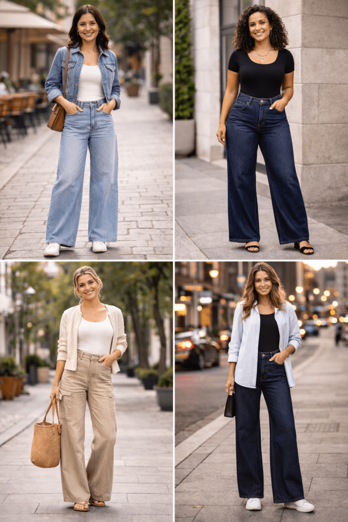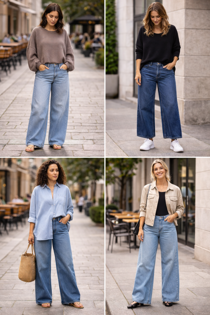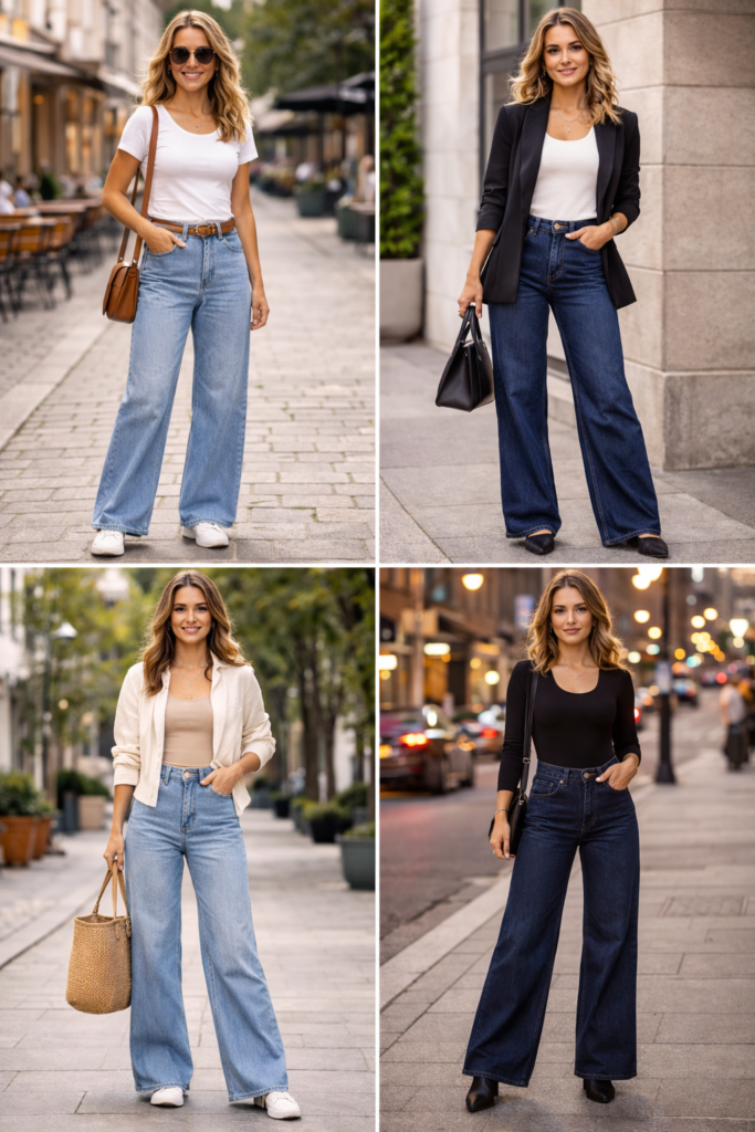 One reason wide-leg jeans are so popular is that they can shift from casual to polished with very little effort. The same pair can work for errands, brunch, travel, or a casual office depending on what you add.