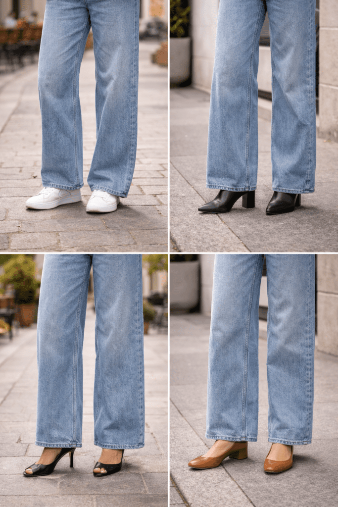 Shoes change the whole mood of wide-leg jeans. They also affect whether the jeans look flattering or awkward, so this is not a small detail.