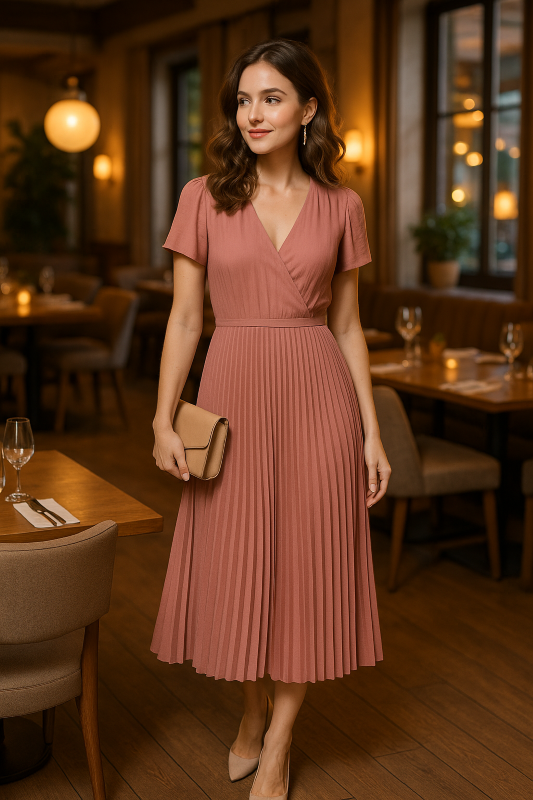 - Pleated midi dress or jumpsuit with subtle neckline